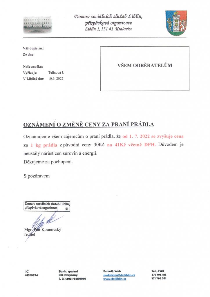 Praní prádla - objednávky přijímá: p. Jitka Telínová, tel. 371 795 201
